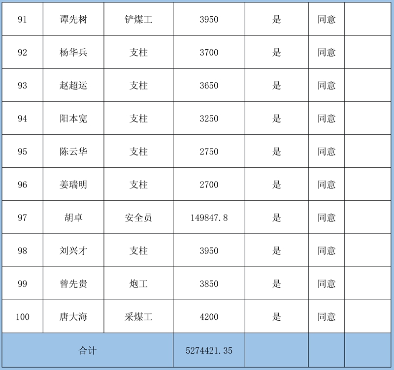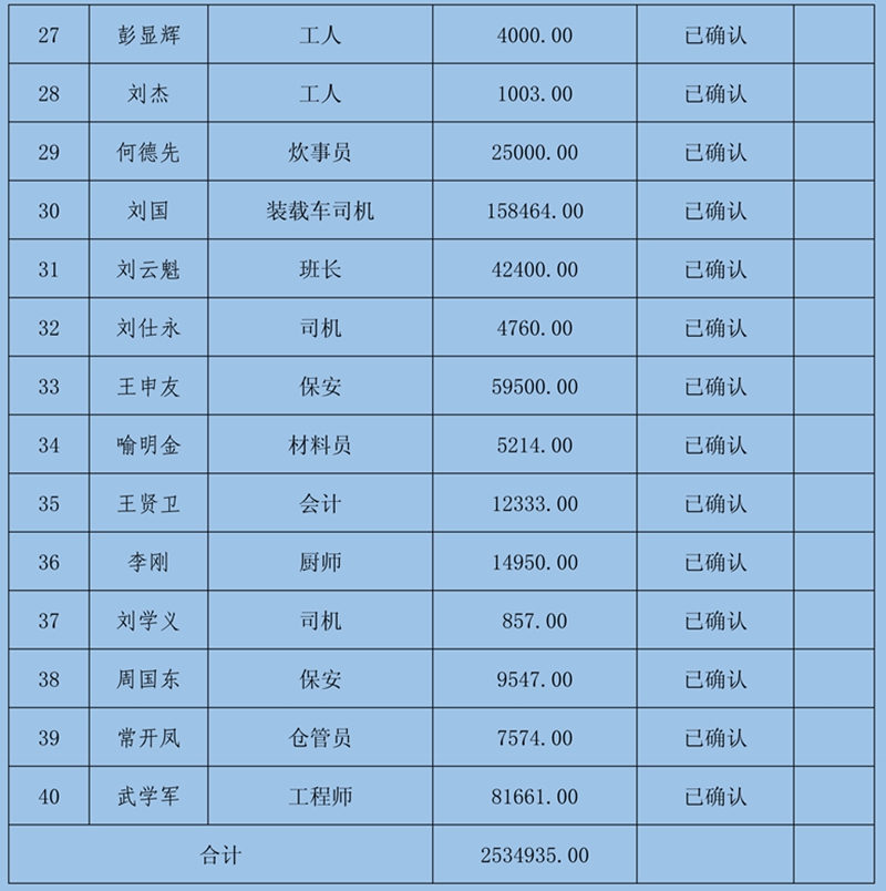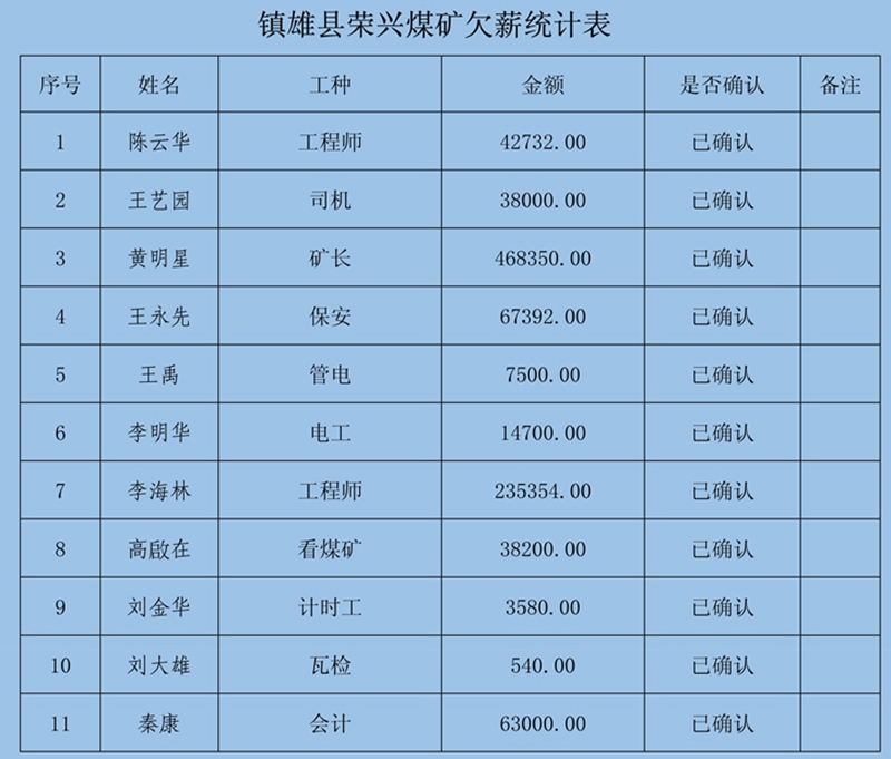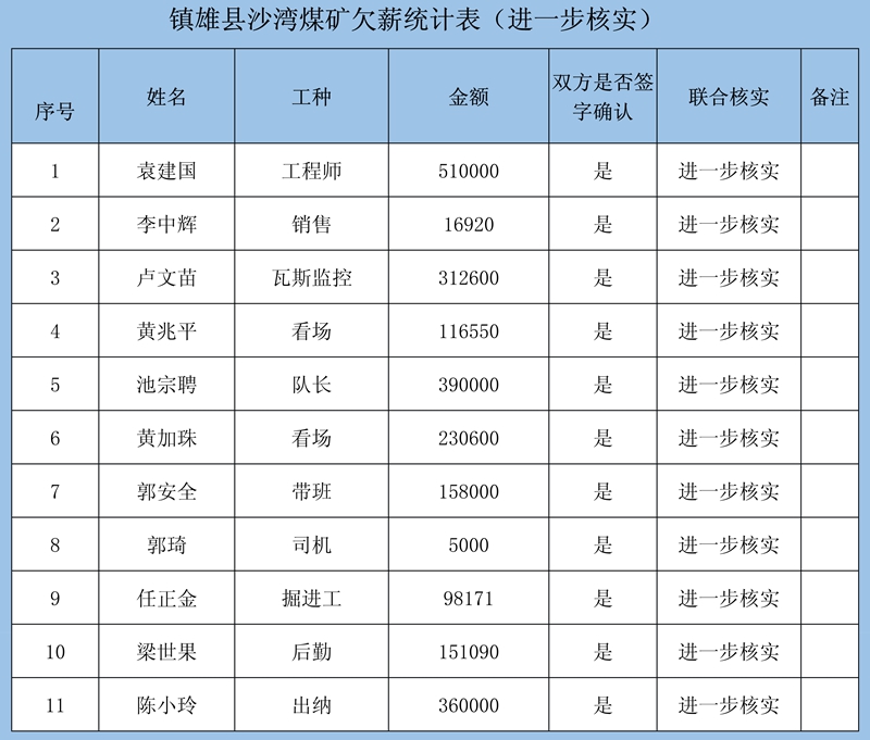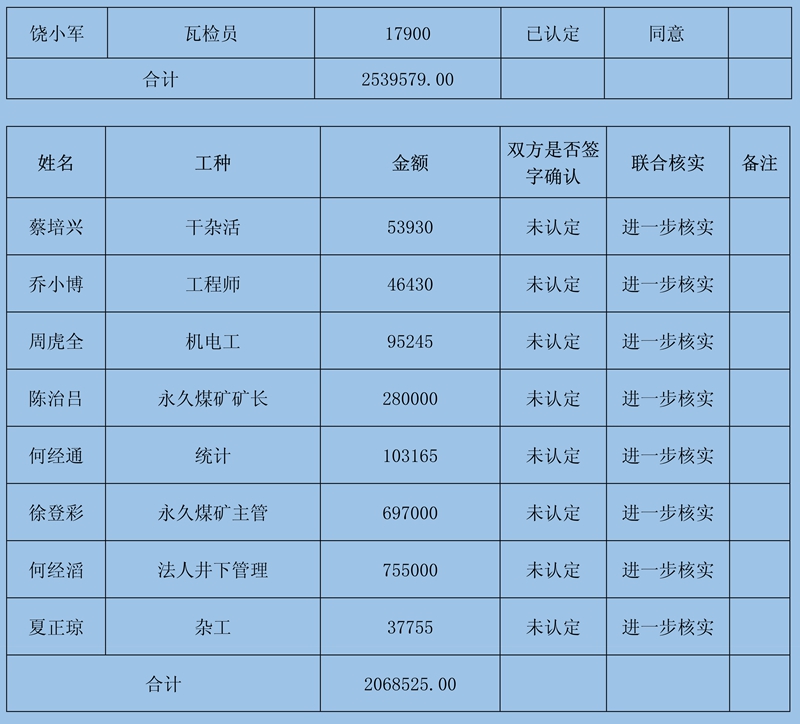 2、本次確認情況:經初核確認,累計共收到41條欠薪證據,涉及41人2539579元;勞資雙方已簽字蓋章確認30條欠薪證據,涉及30人360444元;煤礦方未簽字確認11條欠薪證據,涉及11人2179135元。