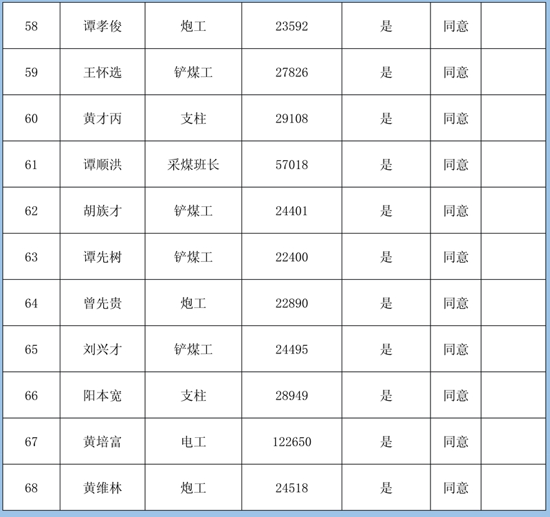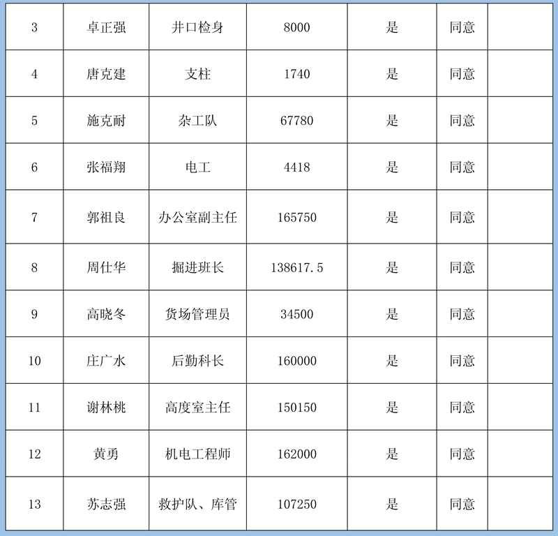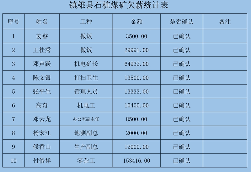 2、本次登記情況:經初核確認,累計共收到12條欠薪申報,涉及12人1595830元;煤礦方已簽字蓋章確認8條,涉及8人413830元。
