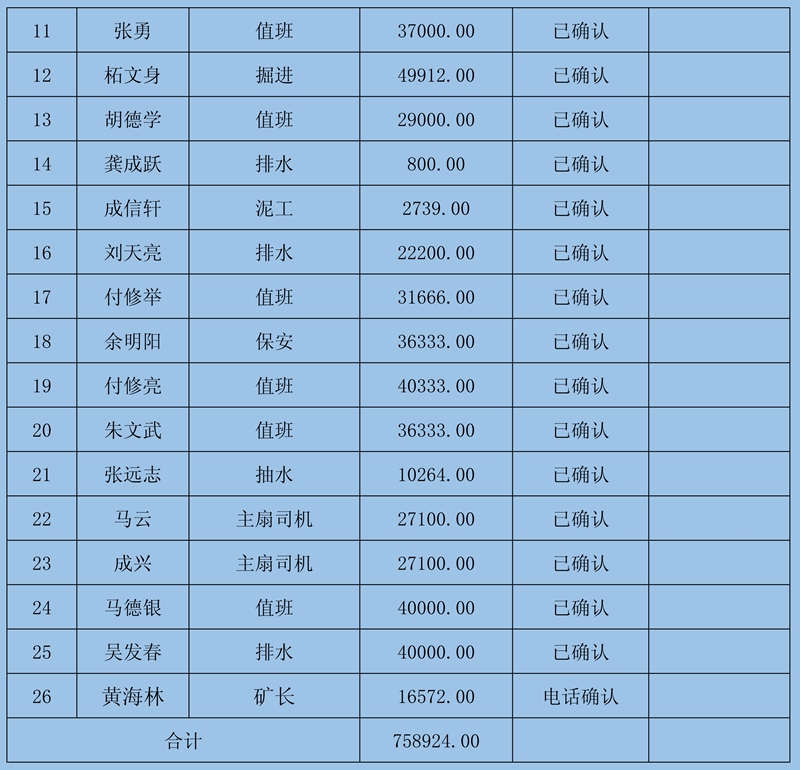 2、本次確認情況:經初核確認,累計共收到25條欠薪證據,涉及25人742352元;勞資雙方已簽字蓋章確認25條欠薪證據;經法人陽建華電話確認1人16572元。煤礦方提供確認名冊一份,其他50名欠薪人員存在以下說明:3名人員證據不足無法確認、10名(兩個工隊)待法院判決后再確認、16名人員欠薪已支付、21名人員由于證據不足無法確認。