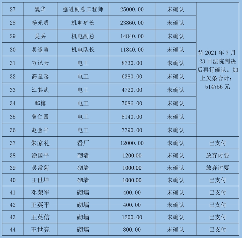 3、其他情況:登記確認過程中魏華、楊光明兩個工隊提供欠薪相關證據,但由于兩個工隊的上級主管歐秀坤已向法院提起訴訟,于2021年7月23日開庭,煤礦表示不知道歐秀坤的訴訟里面是否含兩個工隊的欠薪,待查明情況后再做確認。
