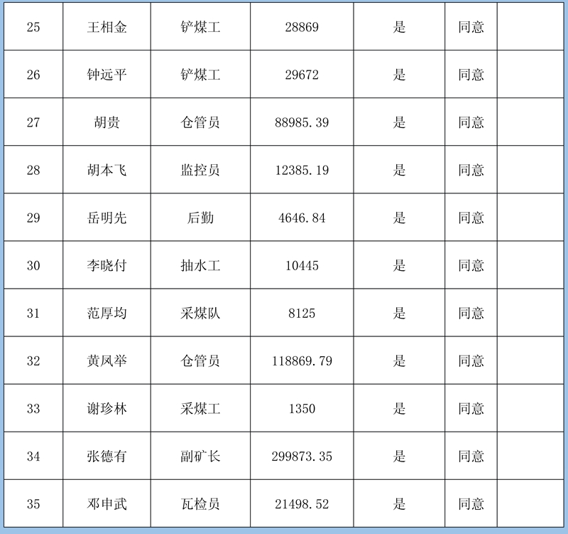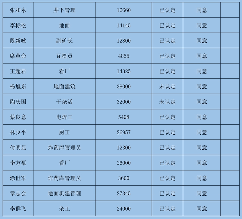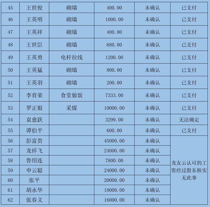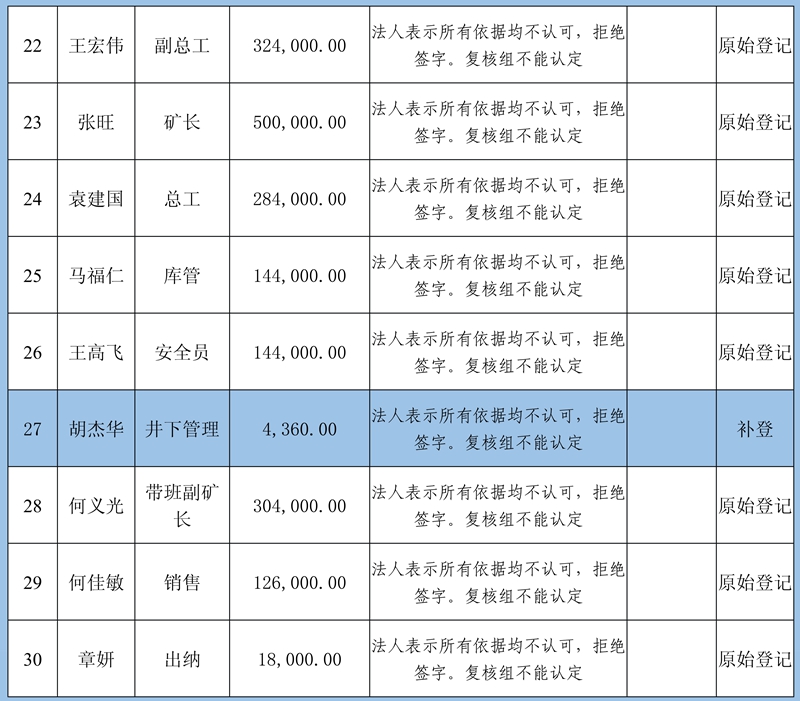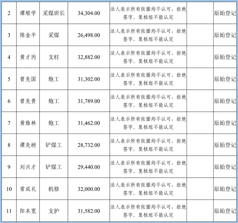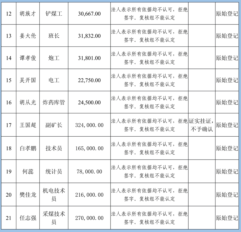 4、復核意見:建議予以確認申報8條金額413830元;需調查核實再行確認3條牟全書、牟全松和白啟波三人的申報,當事人未提供切實欠薪依據,礦方亦不認可;不予確認1條劉永泉申報的欠薪經核實為煤礦轉讓金。
