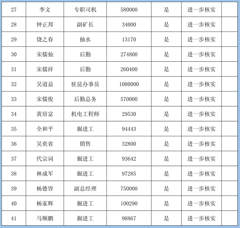 4、復核組意見:①煤礦管理方新提交的5份5人627萬元欠薪資料因證據不足暫緩確認;②羅克雄1415434元雖然提供的證據充足,但由于他是公司的總經理且金額較大,需要再次確認;③其他40條欠薪證據屬實,涉及40人2534935元可以確認。